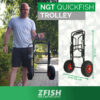 Rybářský vozík NGT Quickfish Trolley je novinka od NGT, jedná se o kompaktní vozík s nafukovacími koly o průměru 25 cm a pevnou ocelovou konstrukcí, který je ideálním pomocníkem na krátké výpravy. Vozík je neocenitelným pomocníkem v případě, že se Vaše lovné místo nachází na vzdáleném místě a vozidlem nepřístupném terénu. Jeho malé transportní rozměry zabírají ve vozidle minimum prostoru, přesto však s přehledem odveze potřebné rybářské vybavení na časově kratší vycházky. Ocelová konstrukce je dostatečně pevná a odolná, a tak vozík uveze téměř vše co se na něj vejde. Na bocích je vozík opatřen dvěmy sklopnými bočnicemi, které rozšiřují úložnou plochu a také slouží k lepší fixaci přepravovaného vybavení. Dostatečně velká a široká nafukovací kola v kombinaci s malými rozměry vozíku spolehlivě zajistí pohodlný pohyb těžším terénem, zarostlými cestami, přes nerovnosti ale i blátem, případně sněhem. Manipulaci s vozíkem a transport vybavení ještě zpříjemní a usnadní EVA úchop a snadno výškově nastavitelné madlo, které si nastavíte přesně dle potřeby. NGT Quickfish Trolley Vás tedy zcela jistě velmi mile překvapí svými kompaktními rozměry a díky pevné konstrukci a velkým kolům Vám při přesunu výbavy od vozu na lovné místo vykouzlí úsměv na tváři.